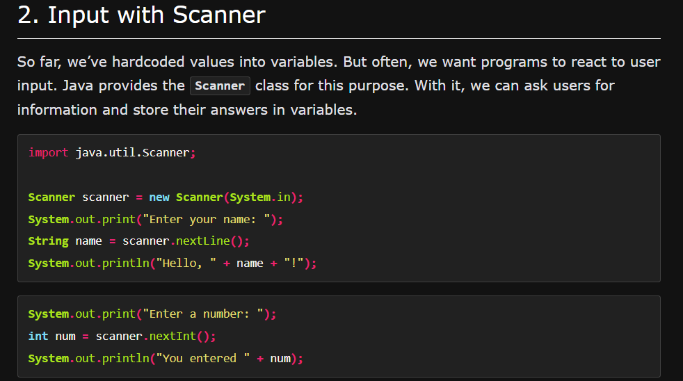 The second sprint was mainly centered around making a lesson regarding the AP CSA curriculum, particularly unit 1. The lesson I worked on 1.4 with my team was all about taking in input for users in Java. It was a bit rocky at the start, but it was an invaluable lesson in correcting and shaping our team dynamics go in the main and final project that we did in sprint 3.